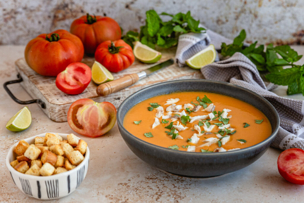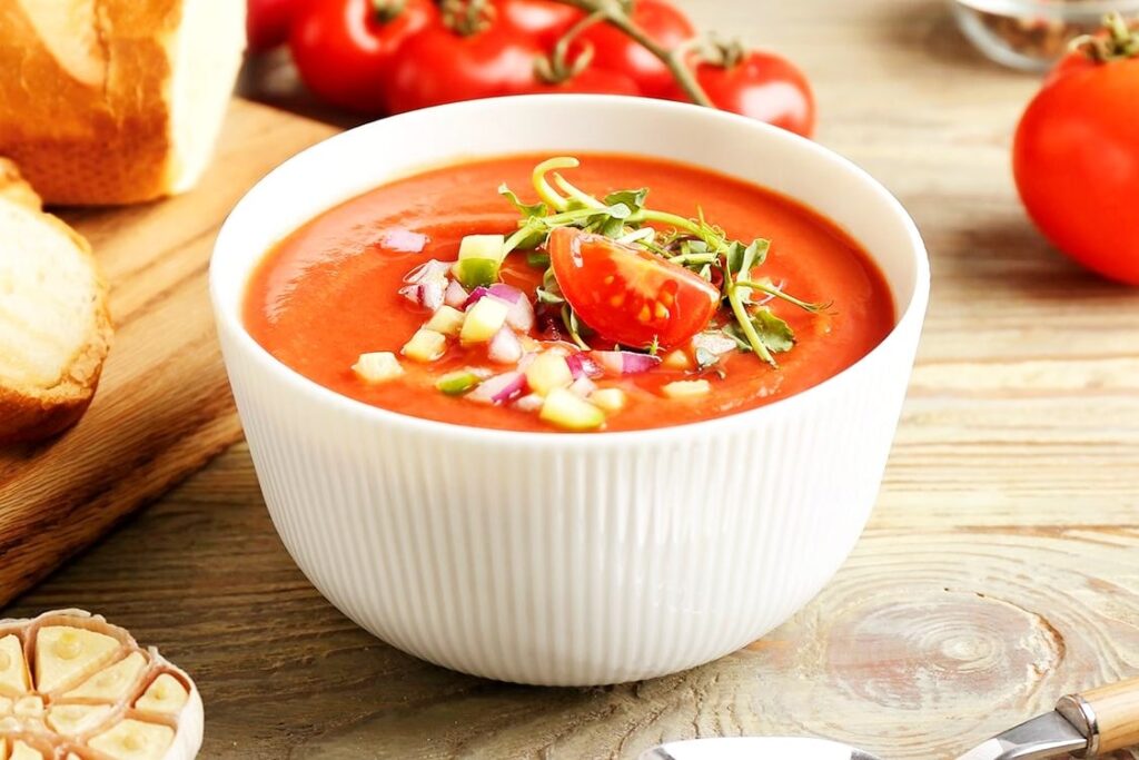 O sabor intenso do tomate, aliado ao pão embebido no caldo, cria uma sopa rica e refrescante, perfeita para os dias de calor.