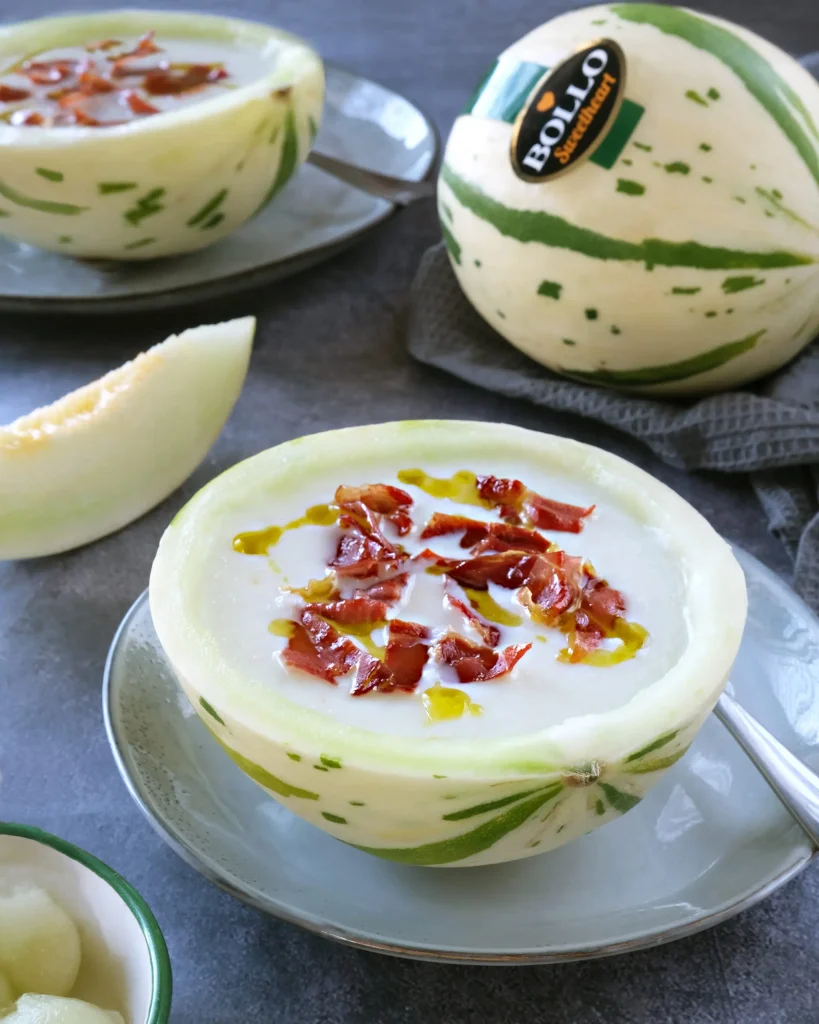 A Sopa de Melão com Fiambre é uma combinação invulgar, mas que resulta muito bem. Esta sopa fria é feita com melão triturado, temperado com limão e hortelã, e servida com fatias finas de presunto.