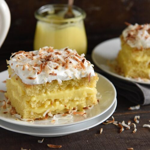 - Retire o bolo do forno, desenforme e depois de frio, regue as fatias de bolo, com a calda anterior e polvilhe com o restante coco.