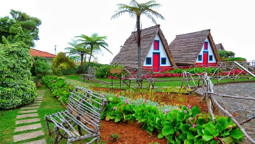 As paredes laterais inclinadas suportam um telhado de colmo de duas águas, que permite a existência de um segundo piso mais estreito. As casas costumam ter também cores vivas, que se destacam da paisagem sempre verdejante.