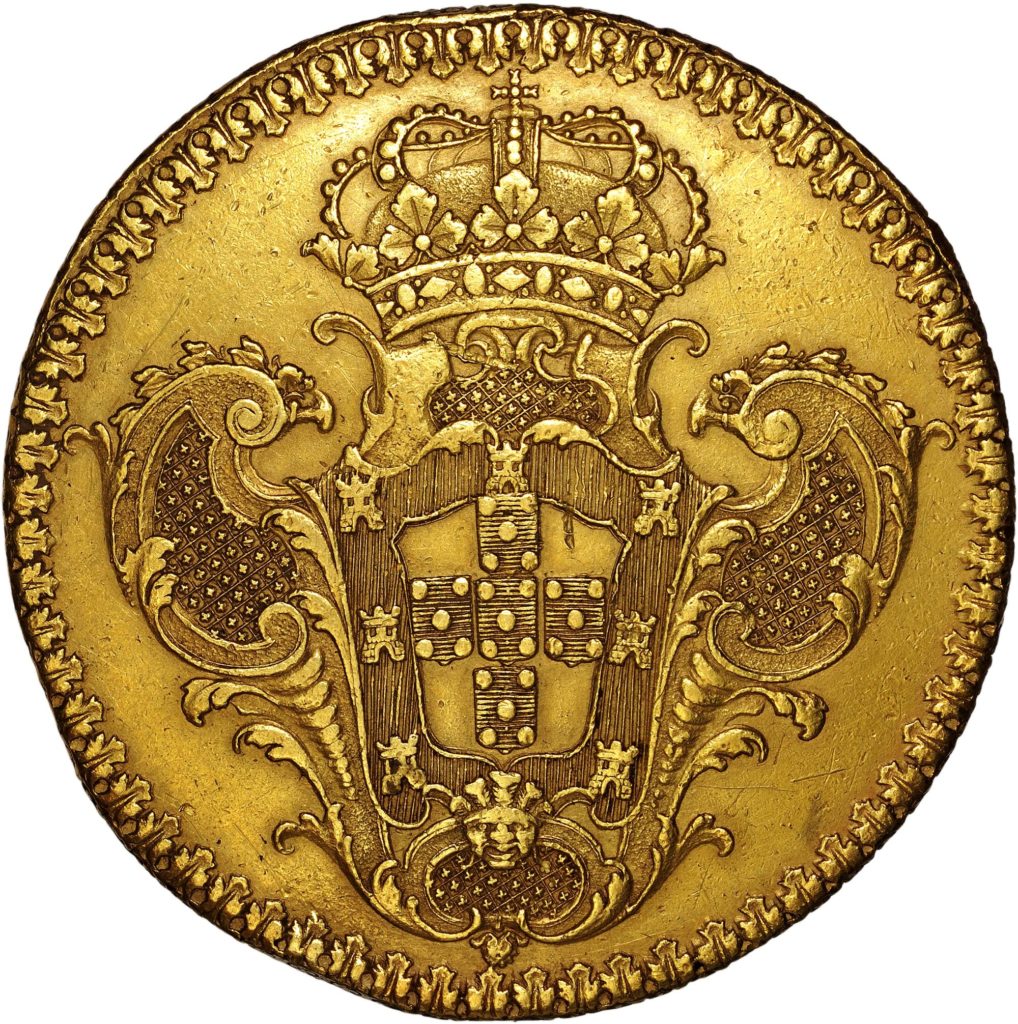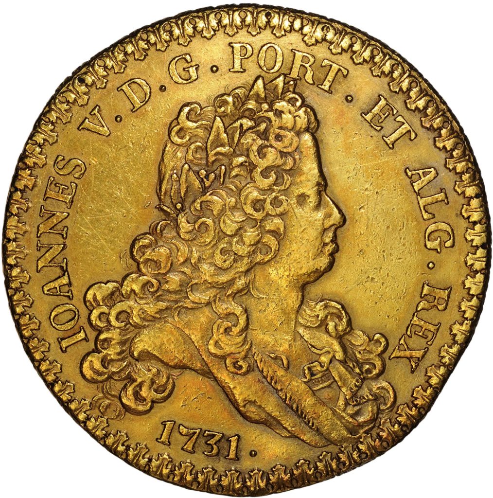 Mas foi também durante este período que se criou a maior moeda cunhada no nosso país e uma das maiores do mundo, a Dobra de 24 Escudos, criada devido a toda a opulência de ouro e diamantes que chegavam aos cofres do Estado naquela época. No anverso desta moeda, encontra-se o busto laureado do rei e, no reverso, as coroas do reino.