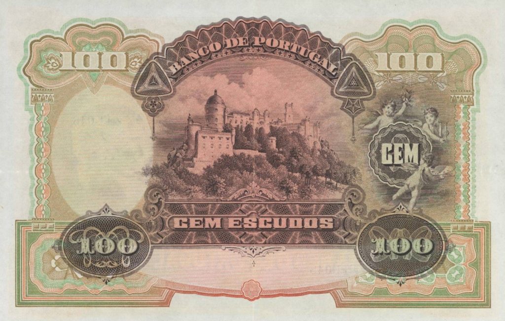 (Atenção: não existem imagens da nota de 100 escudos de 1922. A nota presente na imagem é de 500 escudos do mesmo ano e terá características semelhantes à de 100 escudos, embora com desenhos diferentes).
