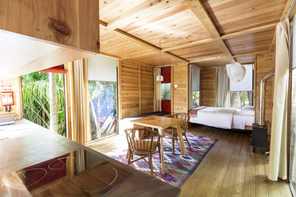 Existem opções de alojamento para 4 ou 2 pessoas, e cada bungalow tem casa de banho privativa, kitchenette, zona de refeições e um jardim privado. Existem também áreas comuns, inseridas numa bonita casa de madeira e vidro. Não podemos deixar de destacar o pequeno-almoço com produtos locais, que se encontra já incluído no preço.