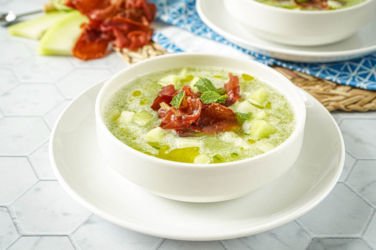 A Sopa de Melão com Fiambre é uma combinação invulgar, mas que resulta muito bem. Esta sopa fria é feita com melão triturado, temperado com limão e hortelã, e servida com fatias finas de presunto.