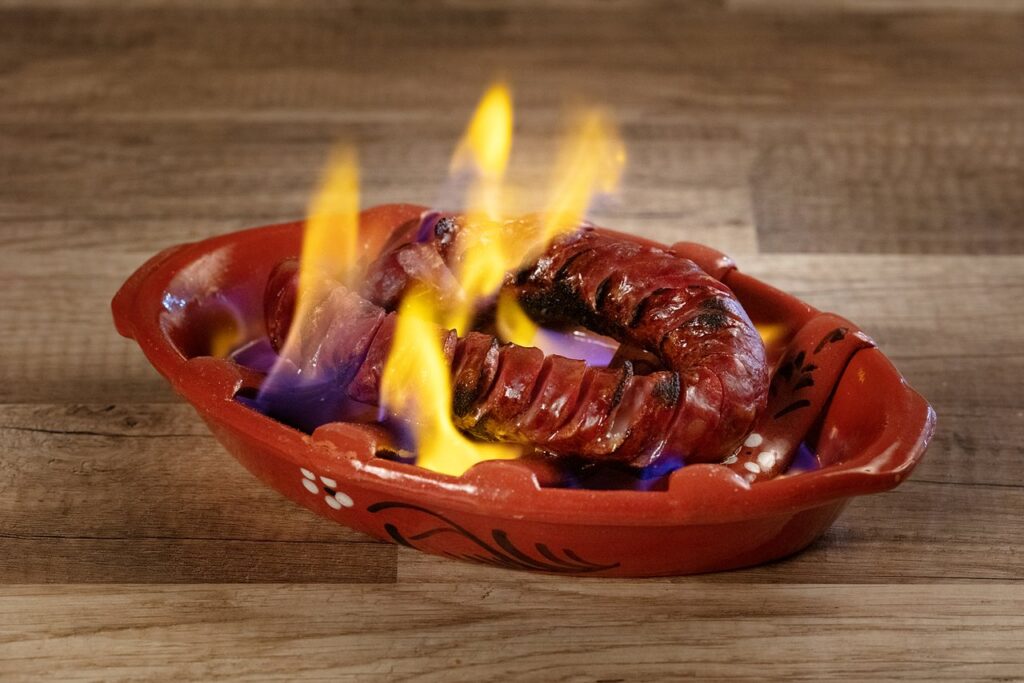 O chouriço assado é um petisco simples, mas muito saboroso. O chouriço é colocado numa assadeira especial e flambado com aguardente, o que realça o seu sabor intenso e fumado.