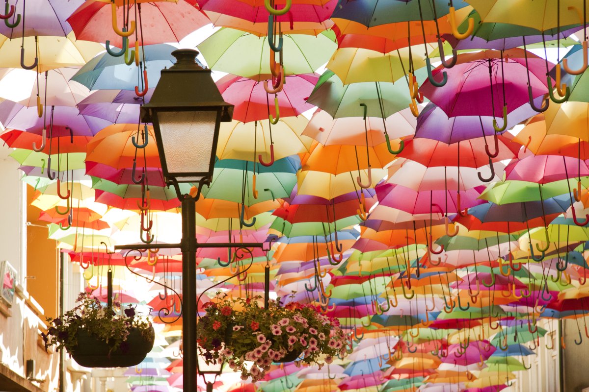 Águeda, localizada no Centro de Portugal, ficou famosa em 2012 pelos seus guarda-chuvas coloridos suspensos. De 1 de julho a 30 de setembro, o Umbrella Sky Project, criado pela agência Sexta Feira, enche as ruas da cidade com guarda-chuvas coloridos e arte urbana. No inverno, a cidade também brilha com guarda-chuvas de Natal.