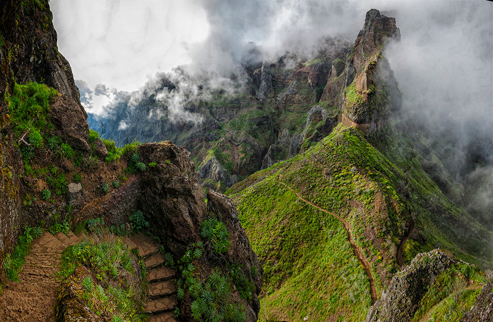 As levadas, antigos canais de irrigação transformados em trilhos, proporcionam percursos com vistas espetaculares sobre montanhas e vales verdejantes.