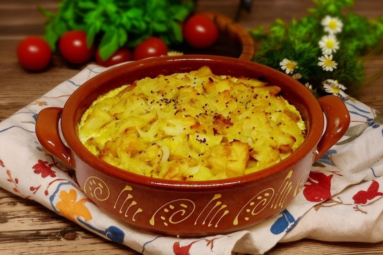 - Disponha numa assadeira uma camada de batatas, cubra com o bacalhau e regue com a cebolada.