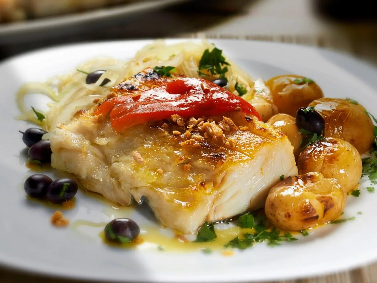 10. Retire o bacalhau e as batatas do forno e transfira-os para uma travessa.