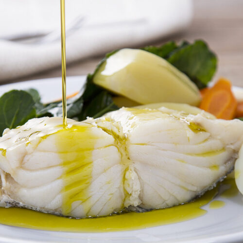Bacalhau às postas cozido, com batatas, couve, cenouras e ovos tudo regado com azeite aquecido com alho. Receita típica de Natal.