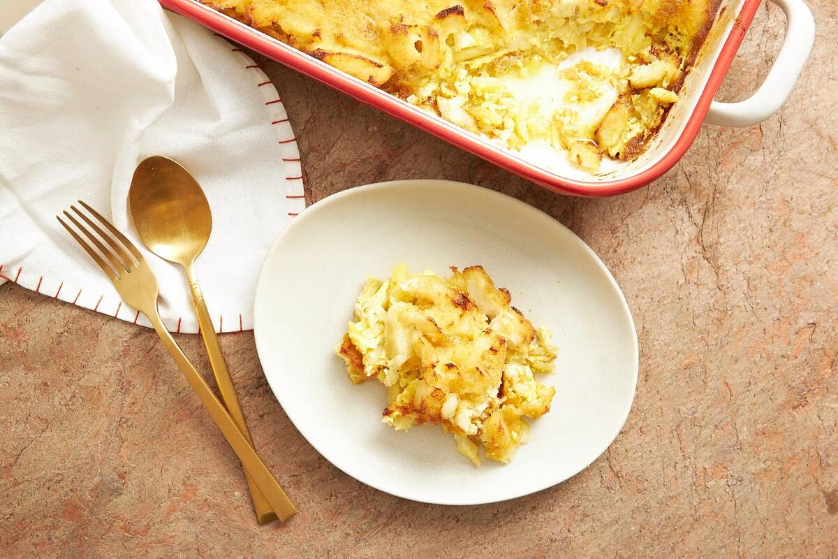 - Num tabuleiro, faça camadas alternadas de batata, bacalhau desfiado e refogado de cebola e alho.