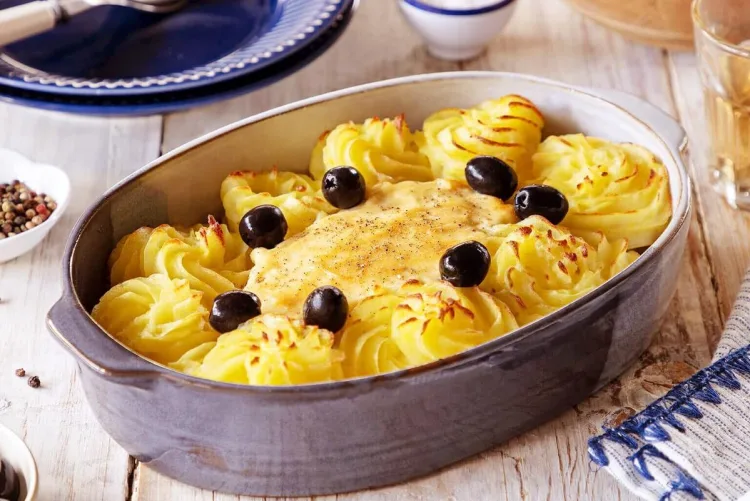 - Espalhe colheradas de puré de batata em volta do bacalhau e alise com uma espátula.