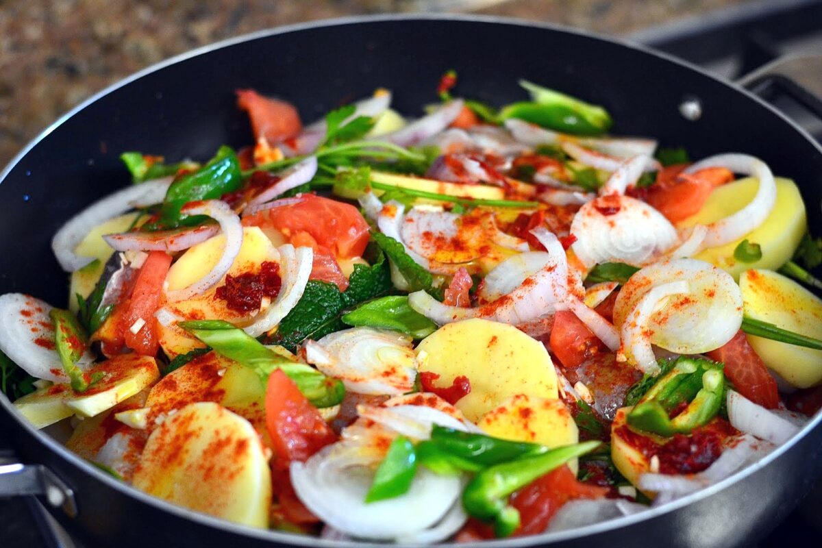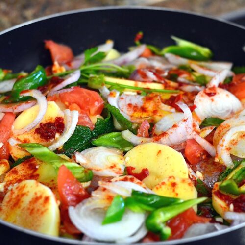 - Parta os pimentos em tiras, a cebola em meias-luas, pique o alho e pele o tomate, partindo-o depois em pedaços. Descasque as batatas e parta-as em rodelas.