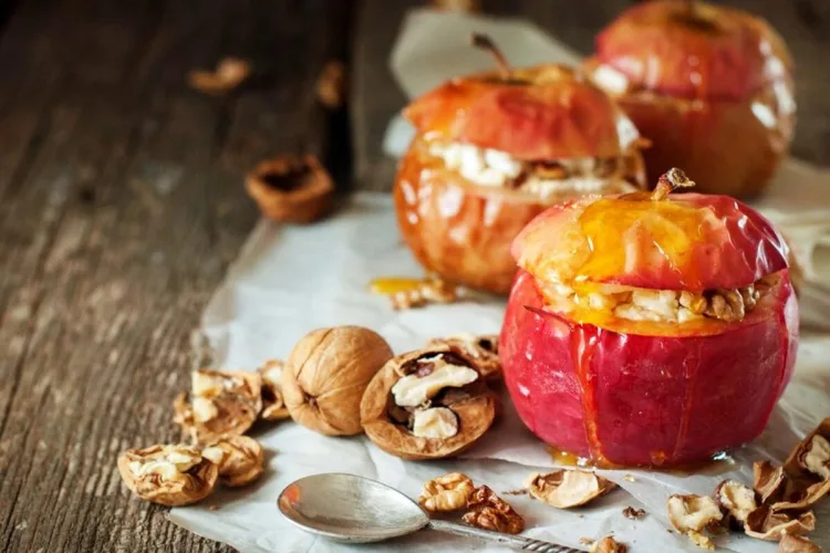 - Coloque as maçãs num tabuleiro e encha cada cavidade com uma colher de mel e algumas nozes picadas.