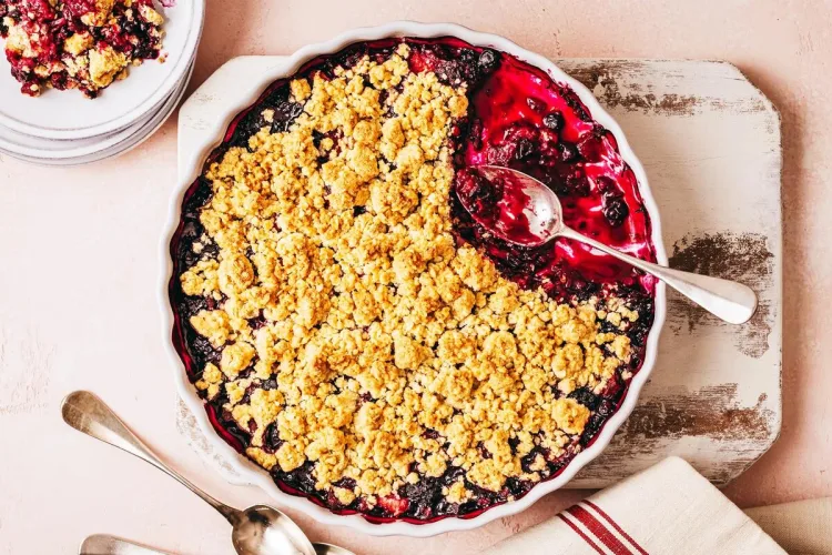 - Leve ao forno por cerca de 30 minutos, ou até o crumble estar dourado e os frutos borbulharem nas bordas.
