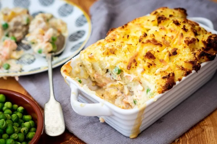 - Num recipiente de ir ao forno, disponha uma camada do puré de batata, seguida da mistura de pescada, e cubra com o restante puré.