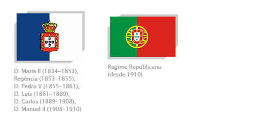 Após a instauração do regime republicano, a bandeira passou a ser bipartida verticalmente em verde escuro e escarlate. Ao centro, o escudo das armas nacionais sobre uma esfera armilar manuelina amarela com detalhes em negro.