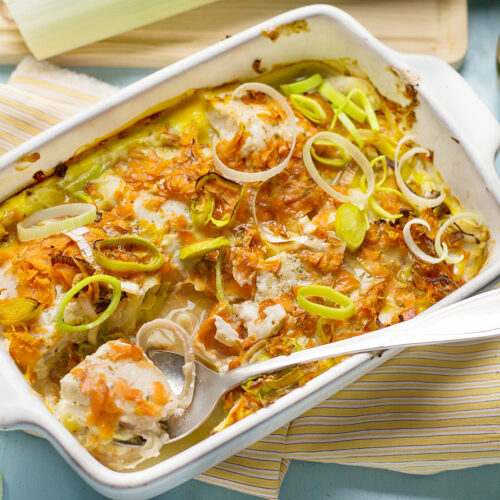 - Junte uma cebola cortada em quartos ao peixe antes de o levar ao forno para um prato mais rico.