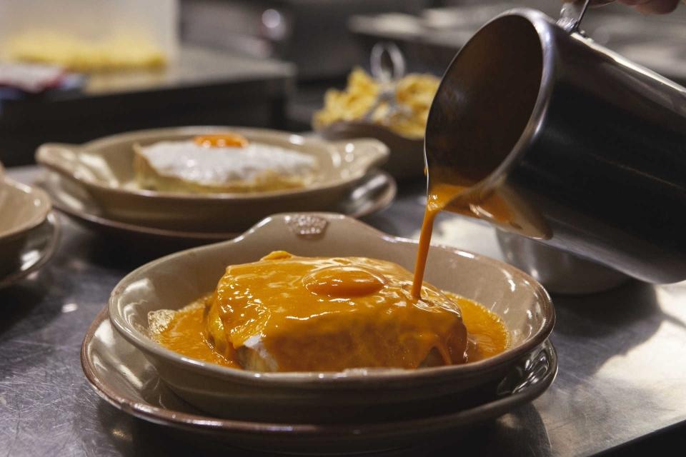 Pode escolher entre francesinha com bife de vaca ou com fêvera de porco. O molho em si é bastante atomatado e bem picante. O local dispõe também de uma esplanada muito agradável.