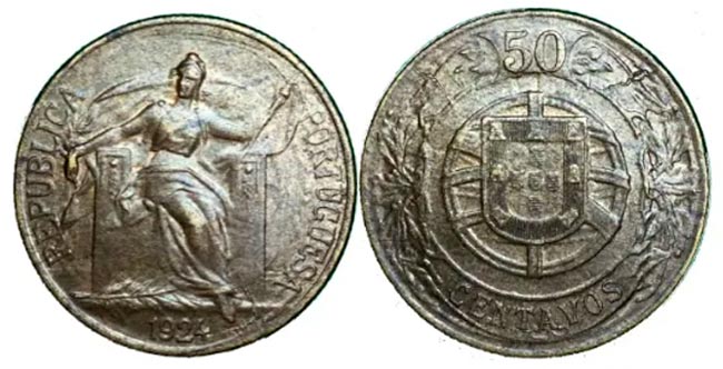 14. Moeda 50 centavos de 1924 (bronze – alumínio): €90 – €350