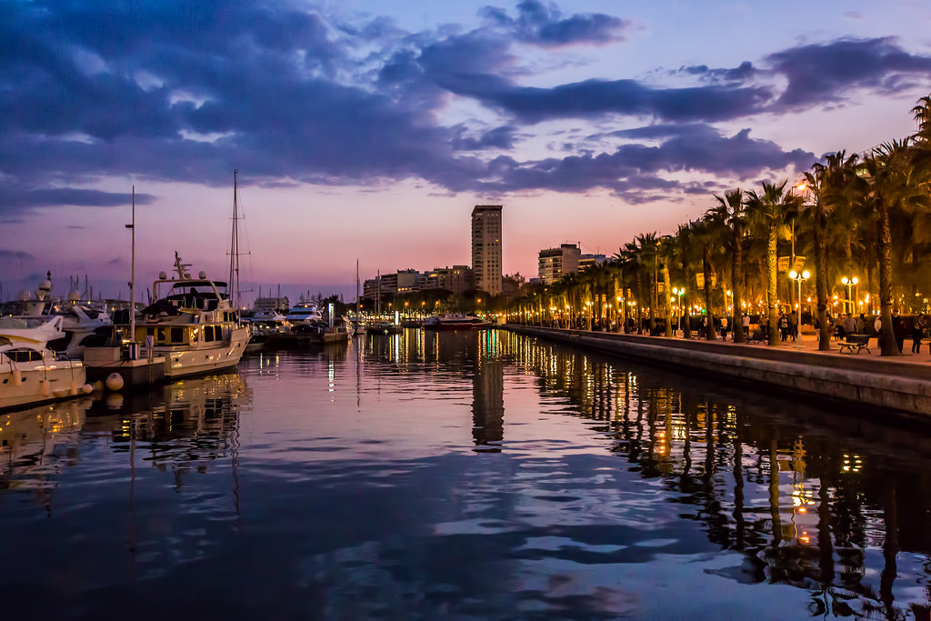 A marina de Alicante é um local encantador com restaurantes elegantes e lojas convidativas. Durante o dia, é ideal para um passeio junto ao mar, enquanto à noite, o ambiente é animado. É um ótimo local para um jantar romântico à beira-mar.