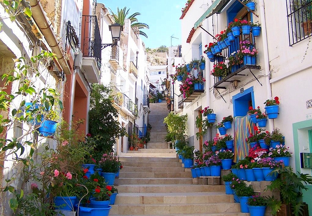 O centro histórico de Alicante, com ruas íngremes e escadas entre paredes caiadas de branco, é encantador. Os moradores decoram as varandas com flores frescas, criando um ambiente pitoresco. Há muitos cafés e restaurantes para descansar e aproveitar a atmosfera local.
