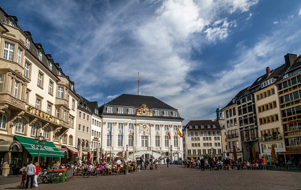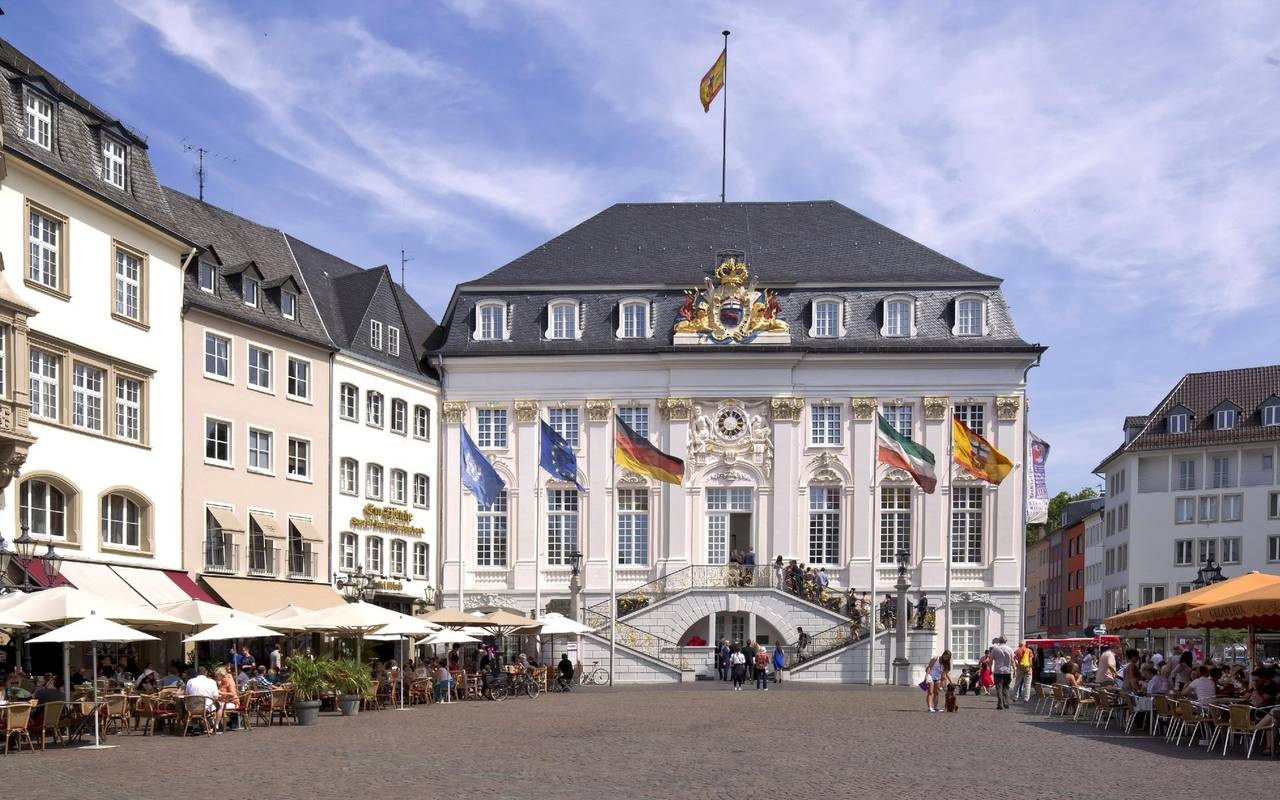 A Câmara Municipal de Bona, um elegante edifício branco com detalhes dourados, serve de pano de fundo à movimentada praça do mercado bonense. Em Dezembro, o Mercado de Natal preenche a praça com luz e música.