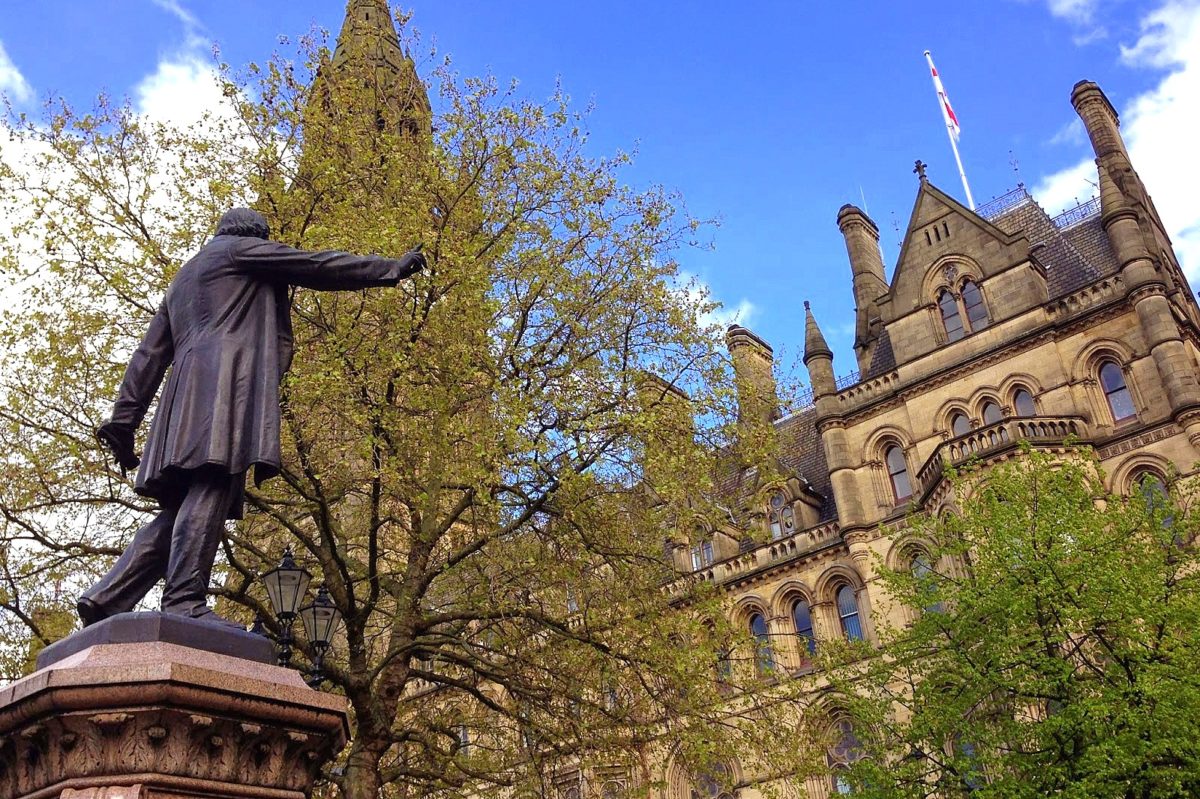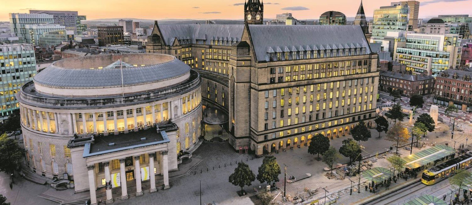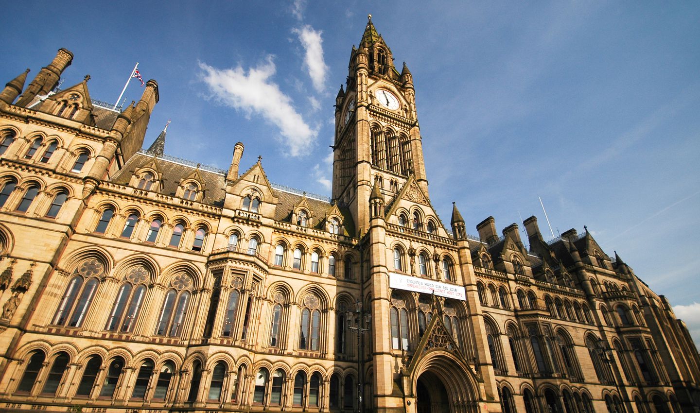 A imponente fachada neogótica da Câmara Municipal enfeita a Albert Square e a torre proporciona excelentes vistas panorâmicas da cidade. A Câmara do Conselho merece atenção especial, juntamente com o ciclo de pinturas de Ford Madox Brown que retratam a história de Manchester. Veja, também, o Free Trade Hall, inaugurado em 1951.
