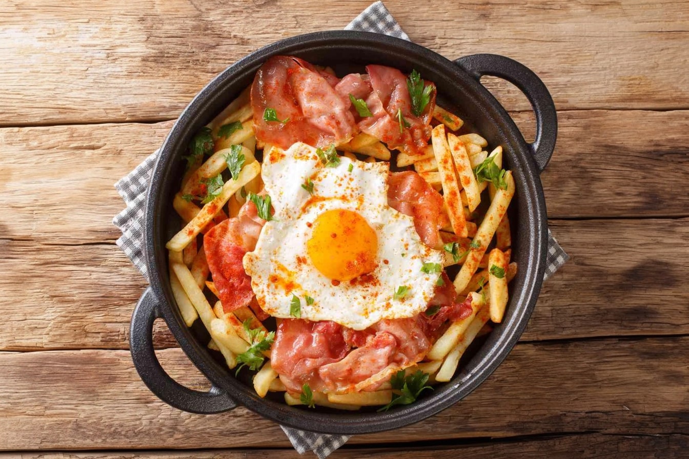 O segredo, se é que existe um, está na fritura das batatas em azeite e na espessura a que são cortadas — nem finas demais para não ficarem só estaladiças, nem grossas demais para não parecerem cozidas. O presunto vai por cima ainda a quente, e o calor faz o resto.