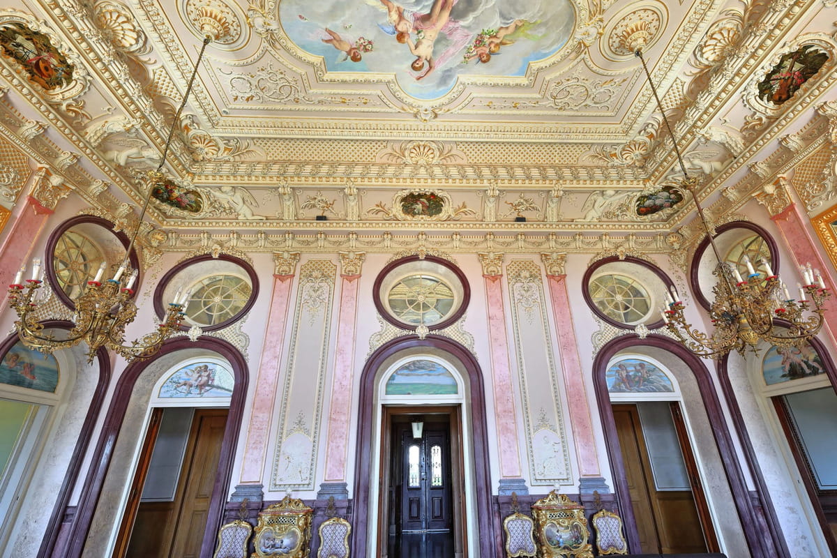 No interior, os salões mantêm frescos nos tetos, estuques dourados e elementos decorativos que remetem para o gosto Neo-Rococó. O Salão Nobre é um dos espaços mais marcantes, tanto pela escala como pelo detalhe ornamental.