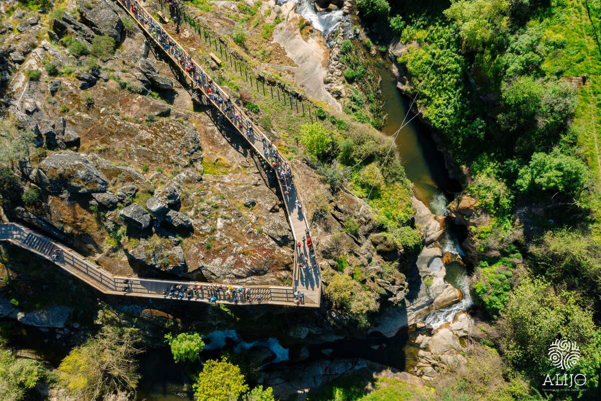 O contraste entre as quedas de água e os terrenos cultivados em socalco é um dos elementos mais específicos deste percurso — não se encontra noutros passadiços portugueses com esta configuração.