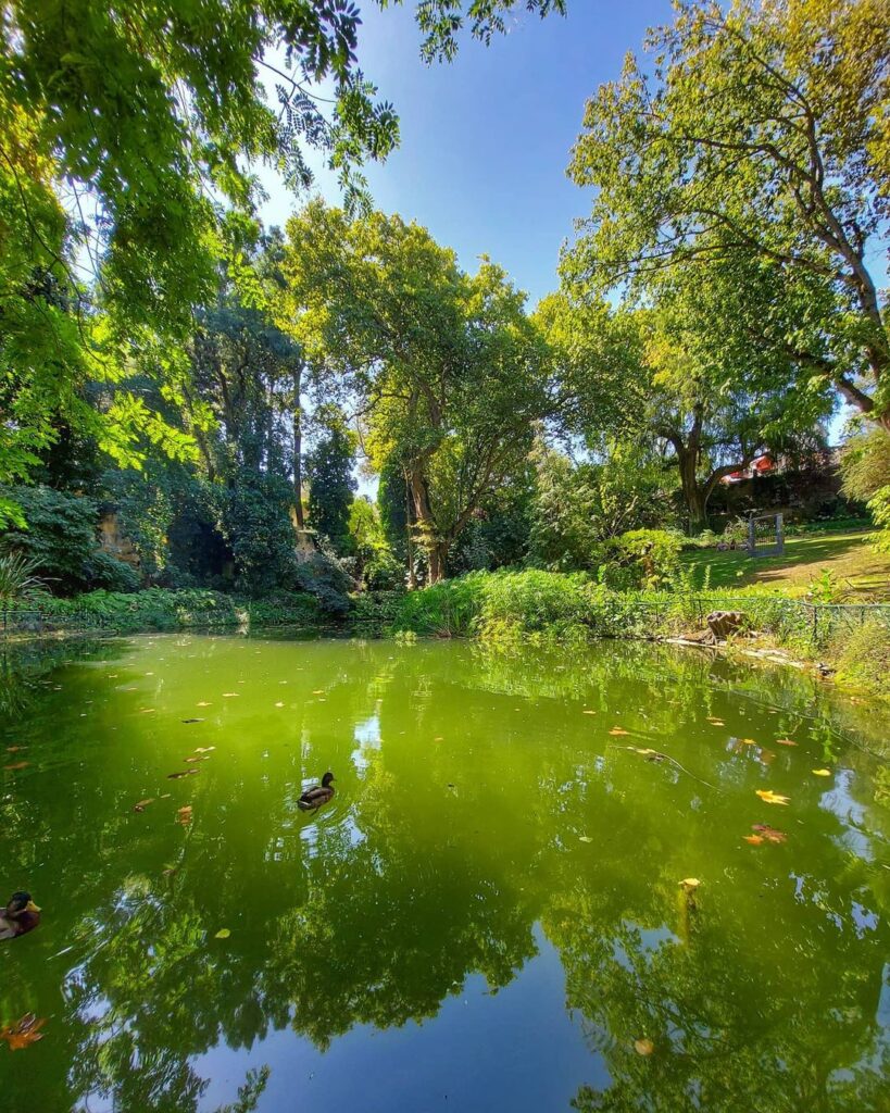 Pode encontrar também mesas e assentos, bem como um amplo espaço relvado. O local é bastante silencioso e convida à contemplação da natureza, num ambiente que nos faz esquecer que estamos numa cidade.
