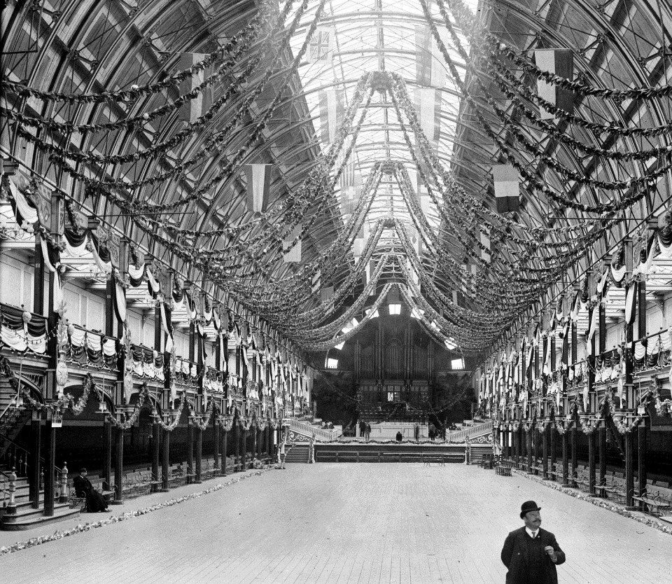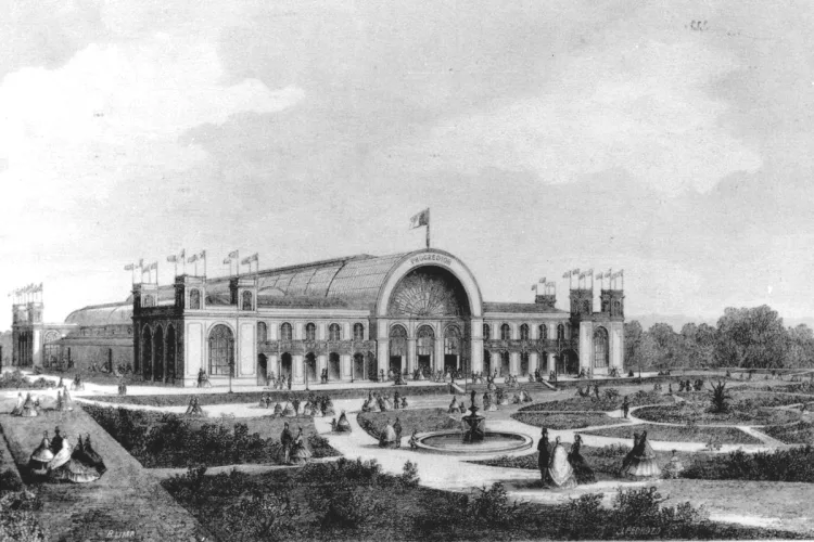 O edifício foi inspirado no famoso Crystal Palace de Londres e foi construído pelo arquiteto inglês Thomas Dillen Jones. Contava com 150 metros de comprimento e 72 metros de largura e estava dividido em três naves.