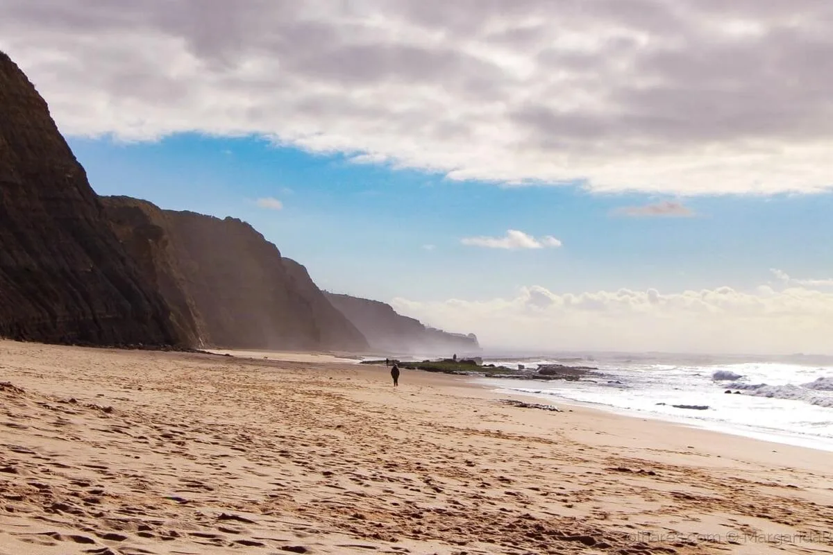É um lugar amplo e silencioso. O areal estende-se ao longo das falésias, num tom dourado que contrasta com o azul escuro do mar.