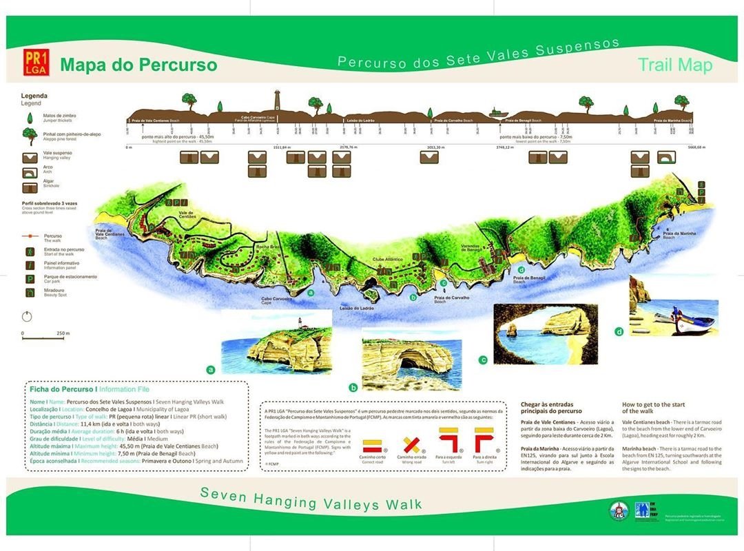 Este percurso linear, que se encontra na freguesia de Lagoa, conta com 5,7 quilómetros de ida, passando pelo topo das arribas algarvias, sendo apenas interrompido por linhas de água, que vão desembocar acima do nível do mar e que dão origem aos vales suspensos. Todo o percurso se encontra muito bem assinalado e tem dificuldade média, podendo ser feito de forma tranquila em cerca de 3 horas (ida e vinda, num total de cerca de 12 quilómetros).