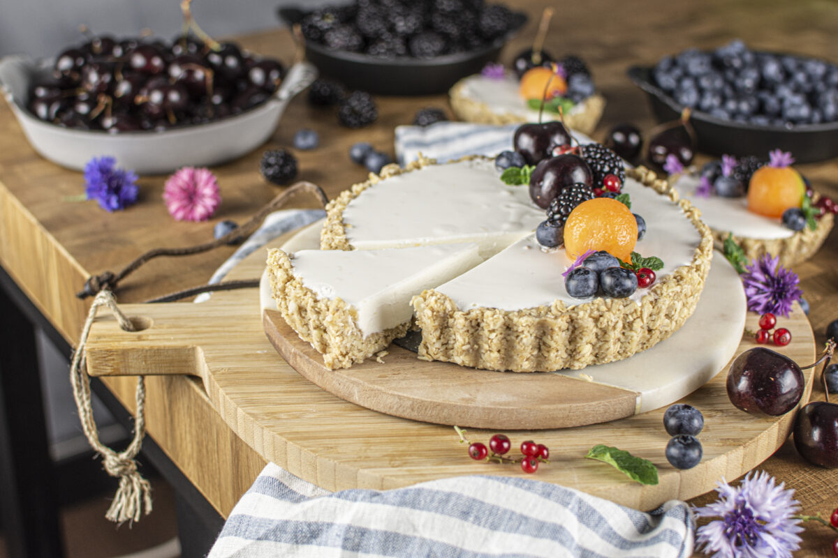 Chega o Verão, o calor aperta e o que sabe mesmo bem é uma sobremesa refrescante. É o caso desta tarte de iogurte com frutos vermelhos. Trata-se de uma receita que não precisa de ir ao forno e que não contém glúten (o que a torna muito saudável).