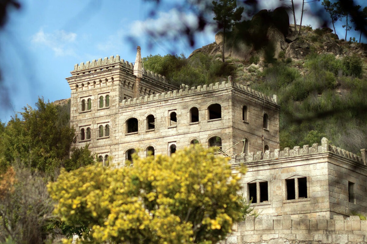 A estrada nacional deixa antever paredes altas entre a vegetação. De longe, ainda se percebe a ambição do projeto. De perto, surgem mosaicos partidos, escadarias expostas ao céu e janelas vazias que enquadram o granito da serra.