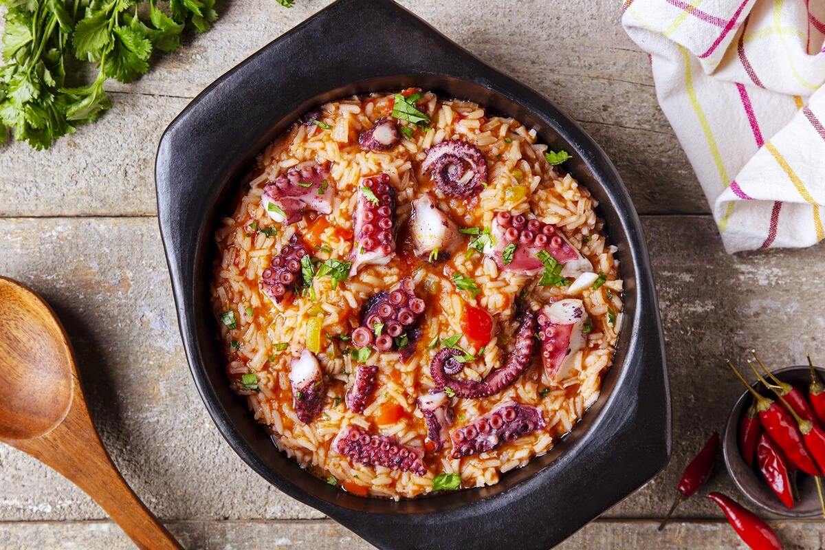 O controlo do líquido é decisivo: demasiado pouco transforma o prato num arroz seco; em excesso, dilui o sabor característico do polvo.