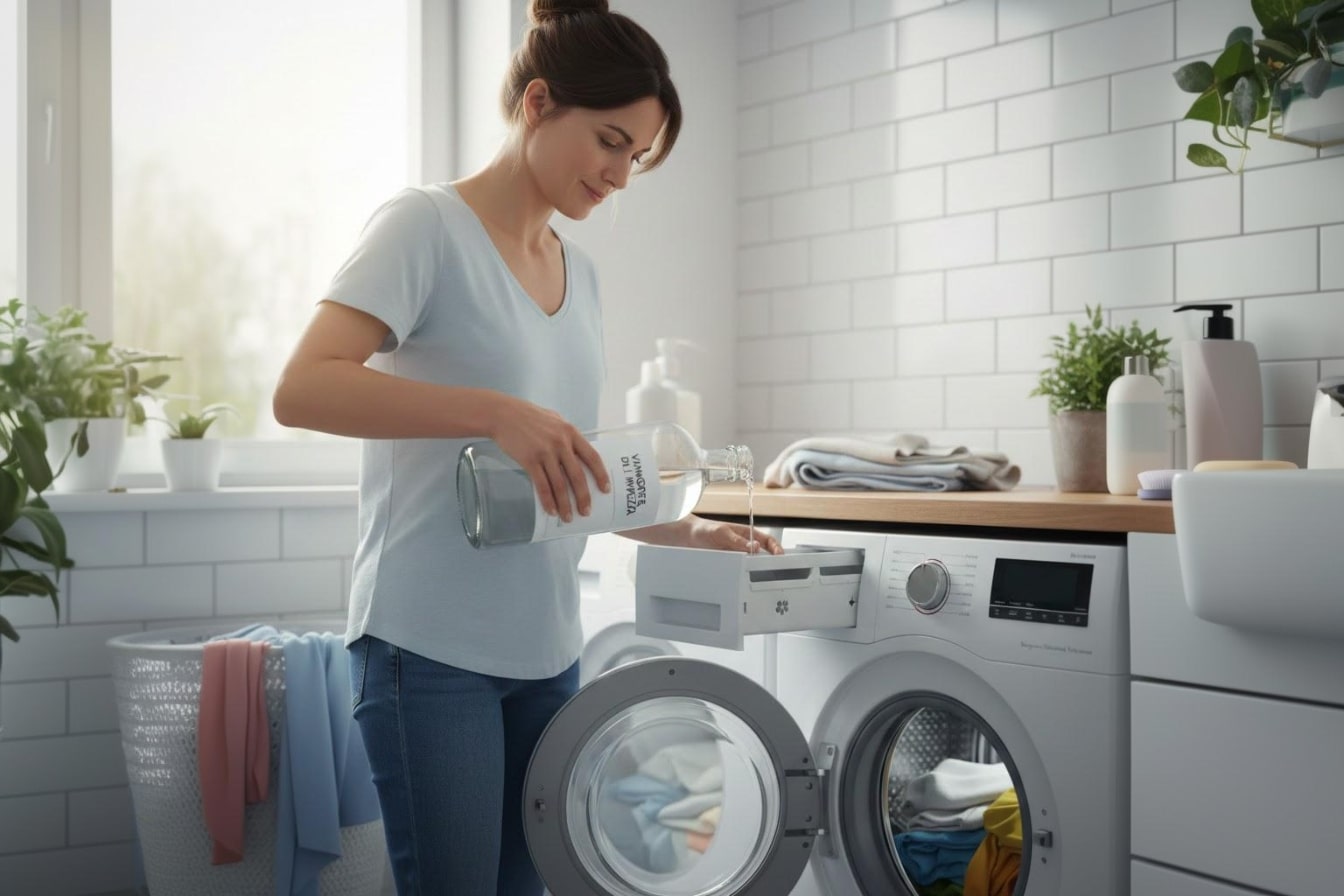 Colocar meia chávena de vinagre branco no compartimento do amaciador ajuda a remover esses resíduos. O resultado são tecidos mais soltos, toalhas mais absorventes e uma sensação de limpeza real, sem películas artificiais.